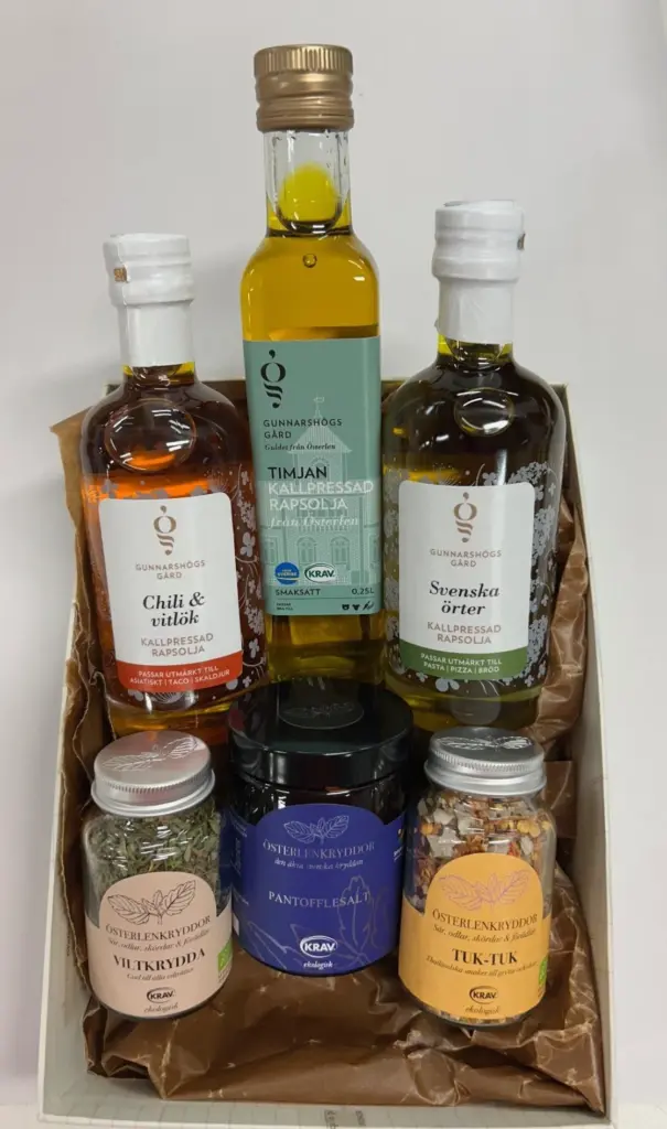 Vi har även en hylla med “Smaker från Österlen” – för er som inte bara vill ha godis med er hem. Här hittar ni rapsoljor från Gunnarshög, kryddor från Österlenkryddor och färskpressad must från Mustmakarna, Småland i all ära men att få med sig en smak från Österlen är heller aldrig fel.